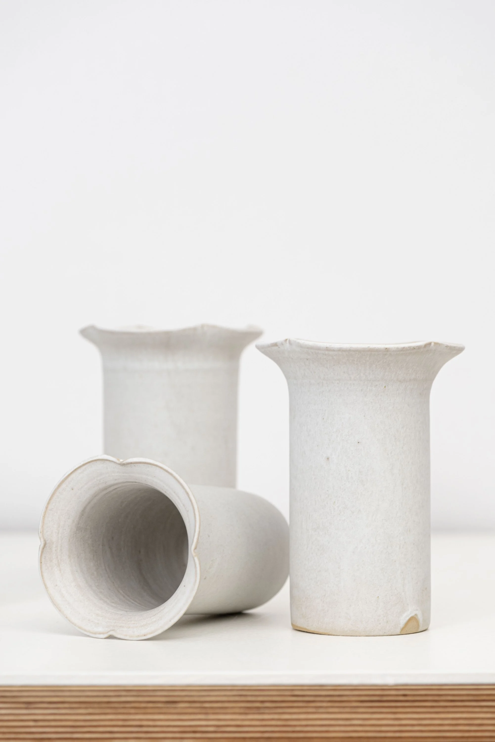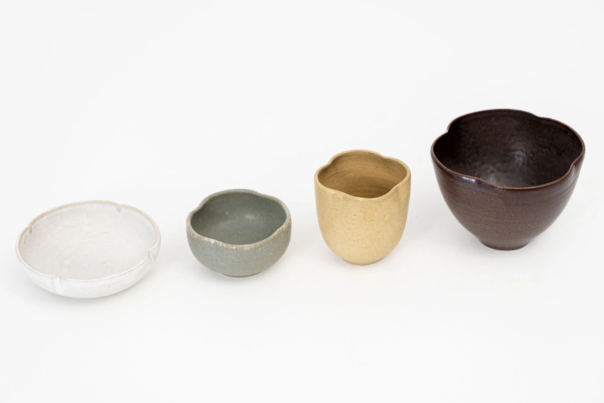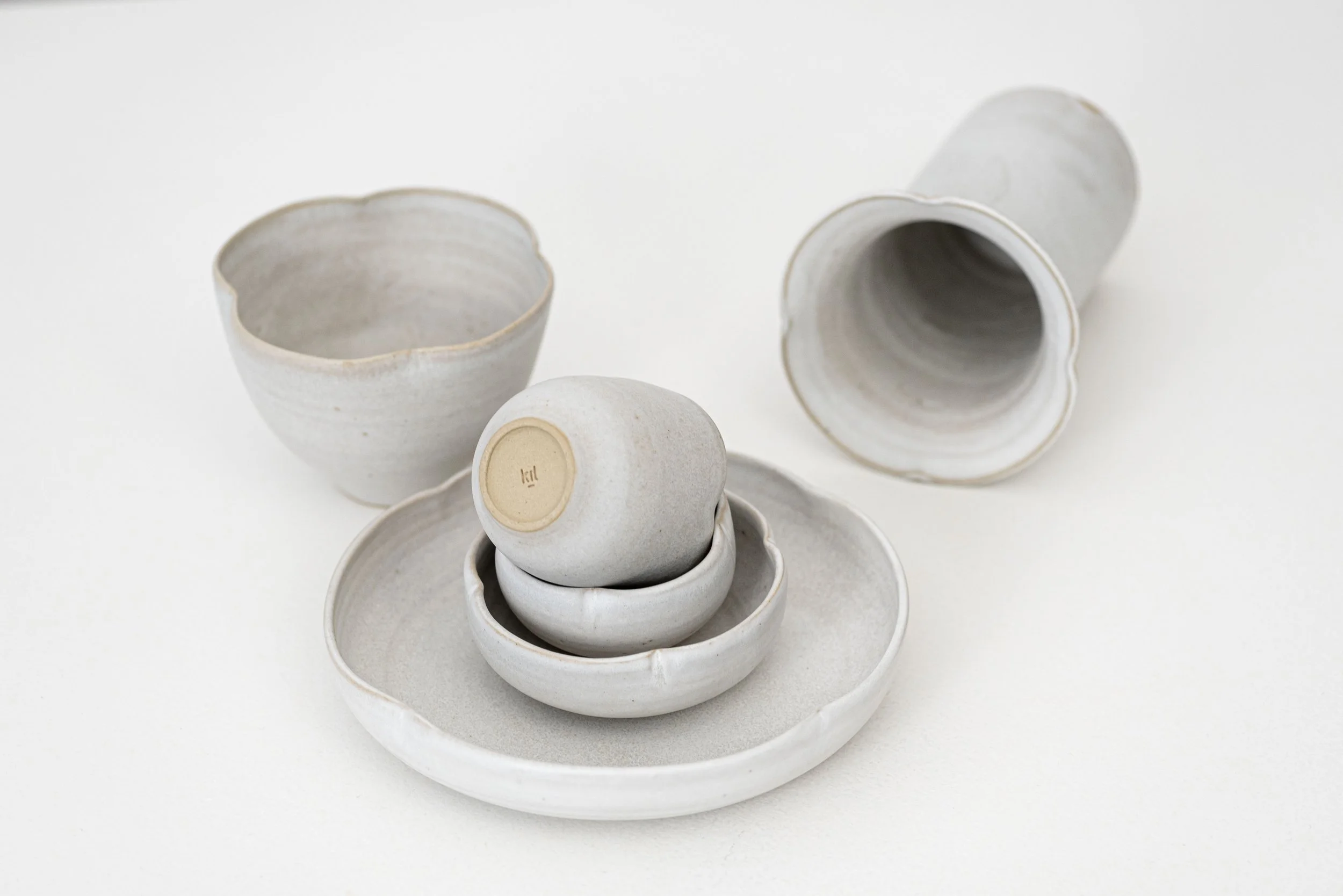 Toutes les pièces sont réalisées en grès de Puisaye et sont tournées et déformées à la main pour évoquer une forme de fleur.