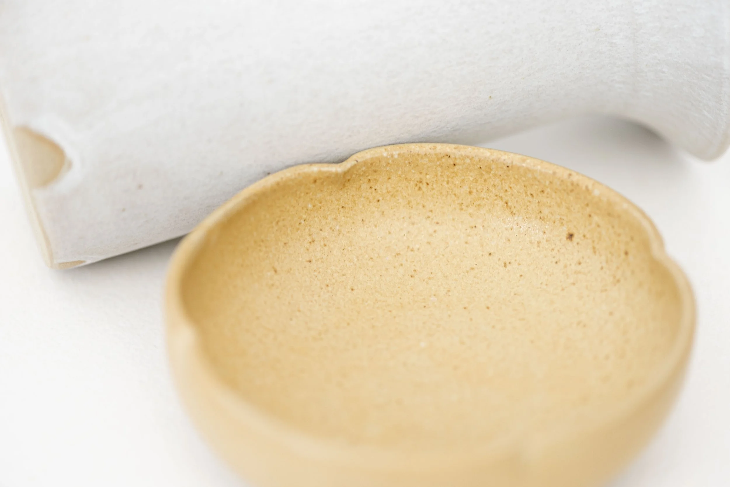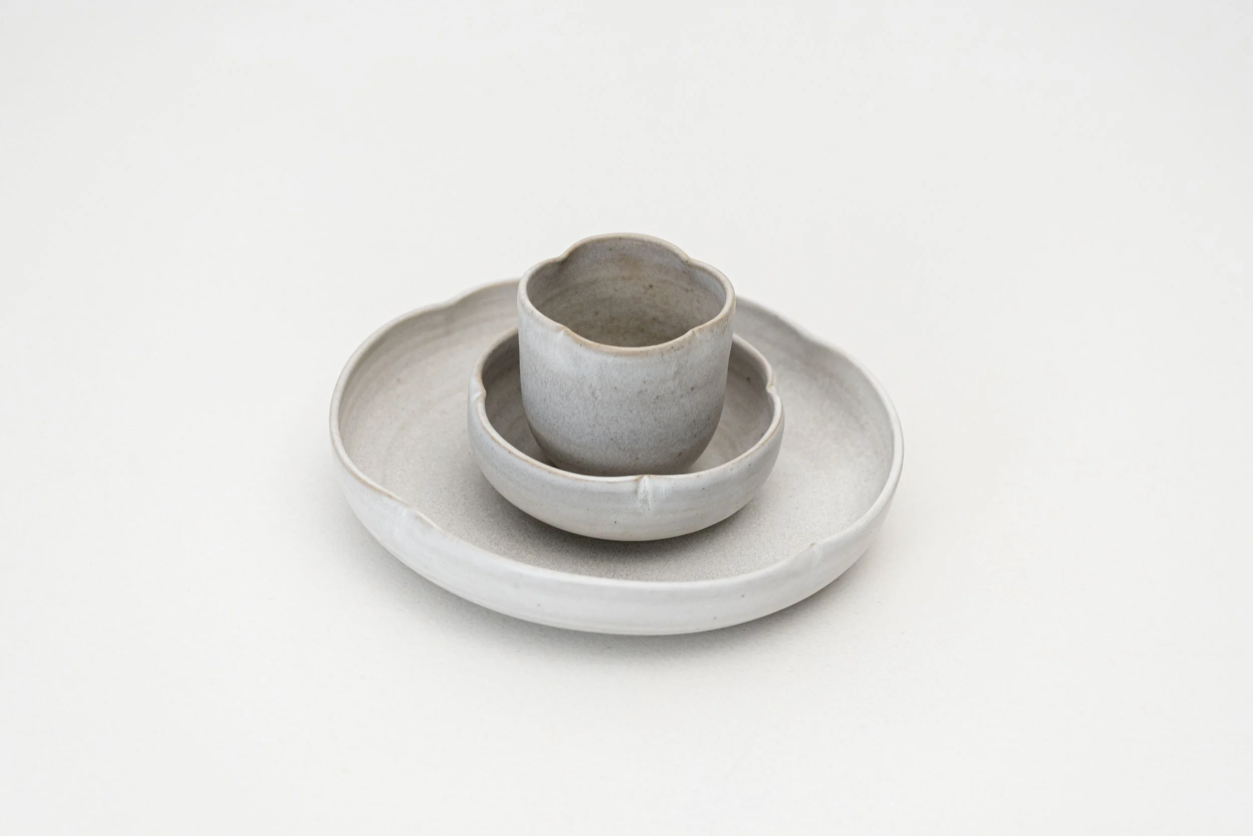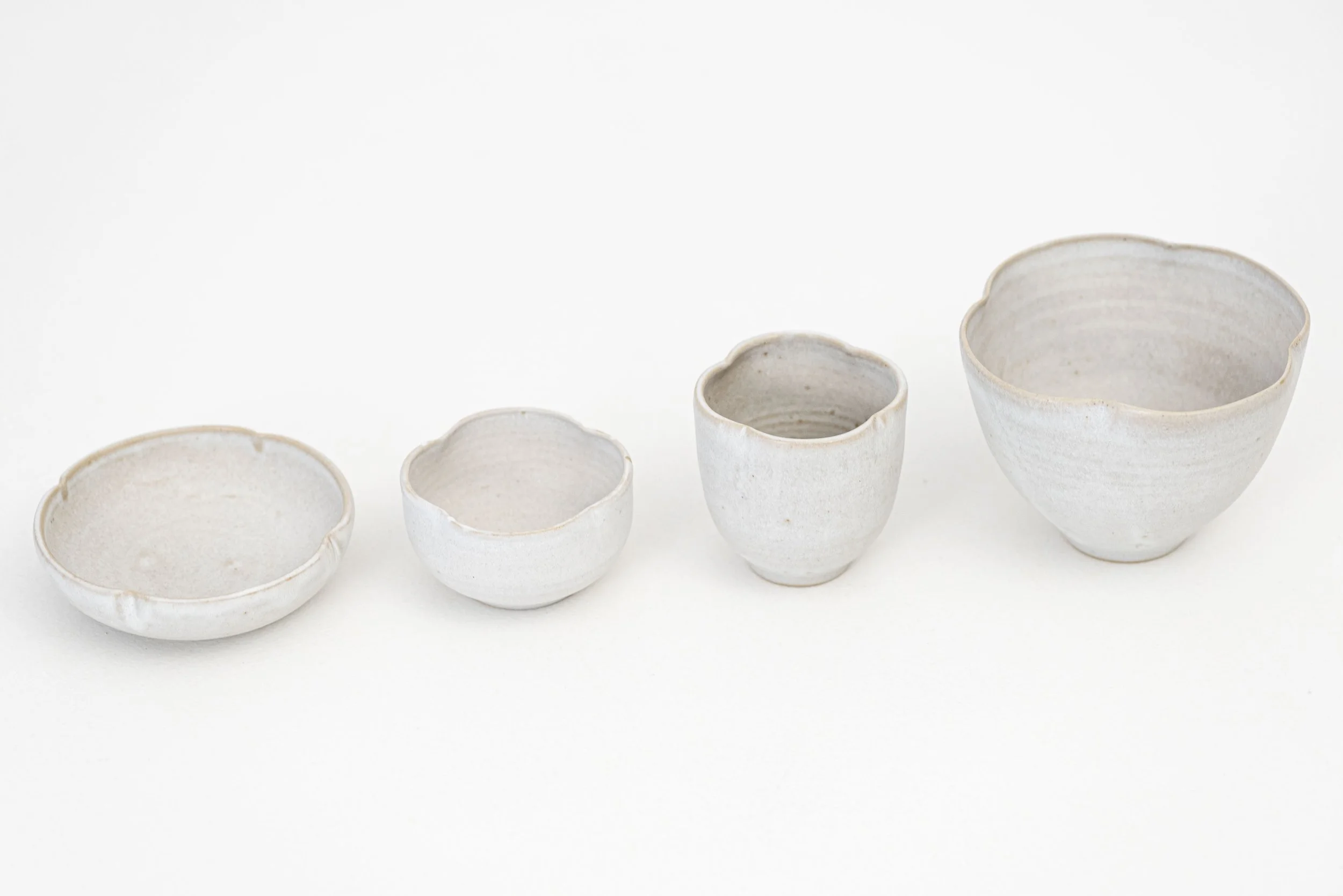 Toutes les pièces sont réalisées en grès de Puisaye et sont tournées et déformées à la main pour évoquer une forme de fleur.