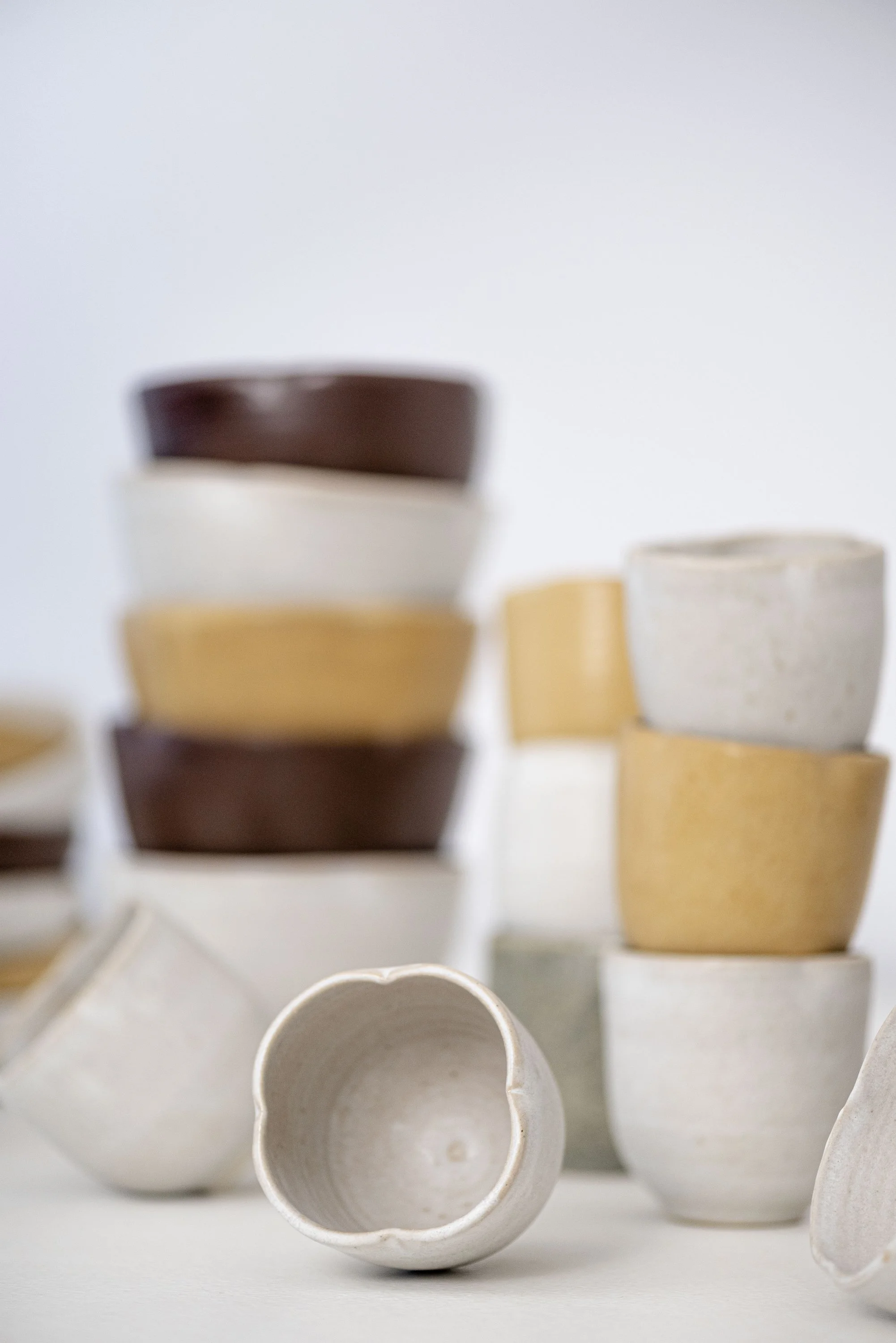 Les pièces de la collection FLEUR sont composées de pièces de vaisselle et de décoration : tasses, coupelles, bols, assiettes et vases.